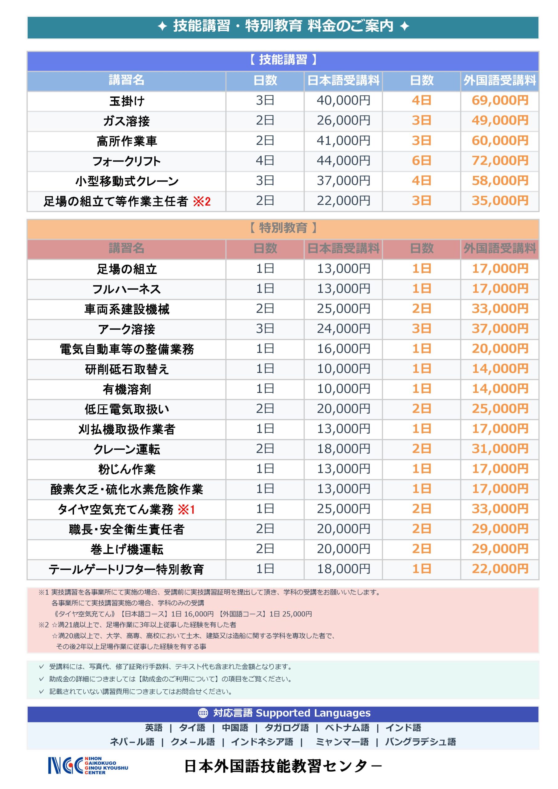 講習費用一覧表